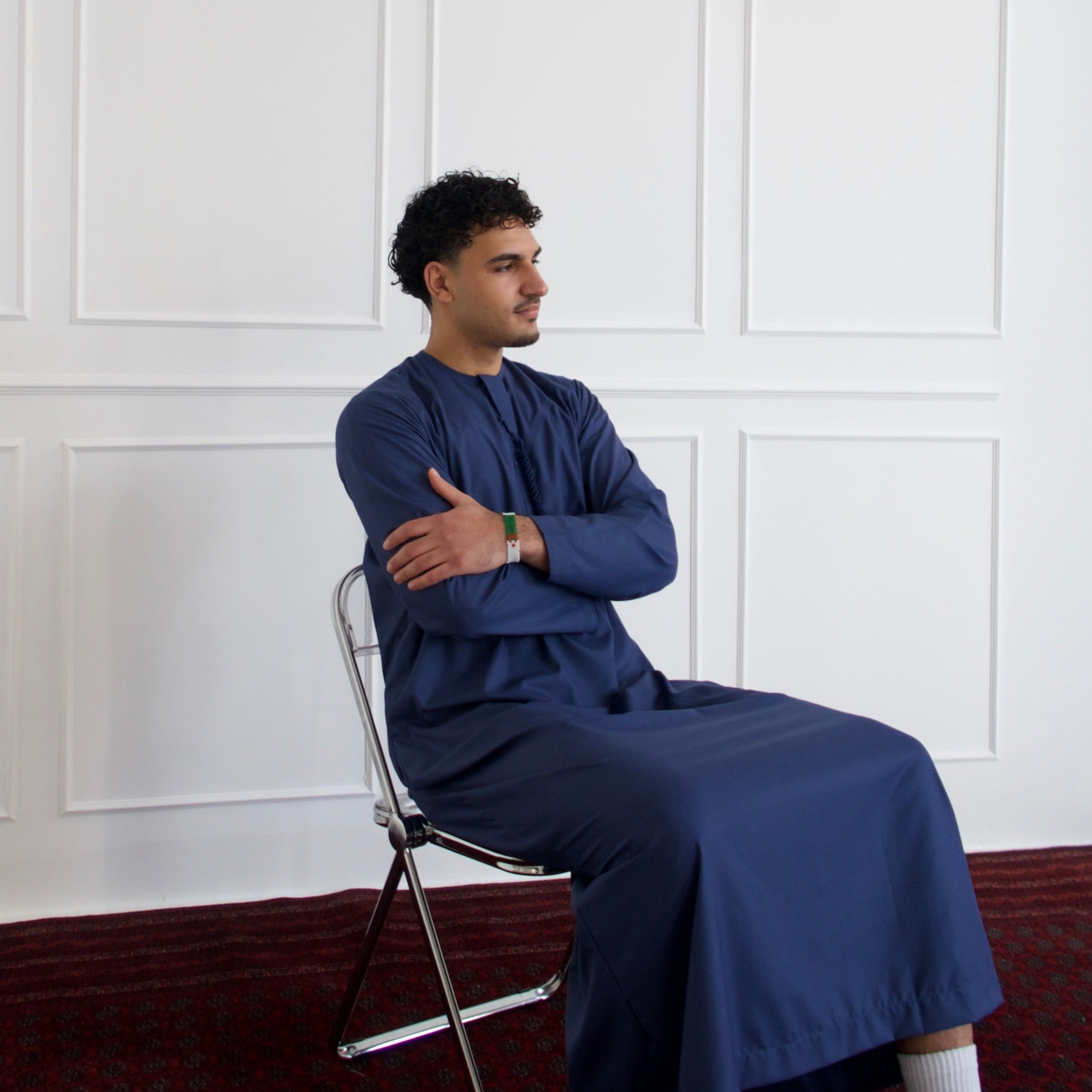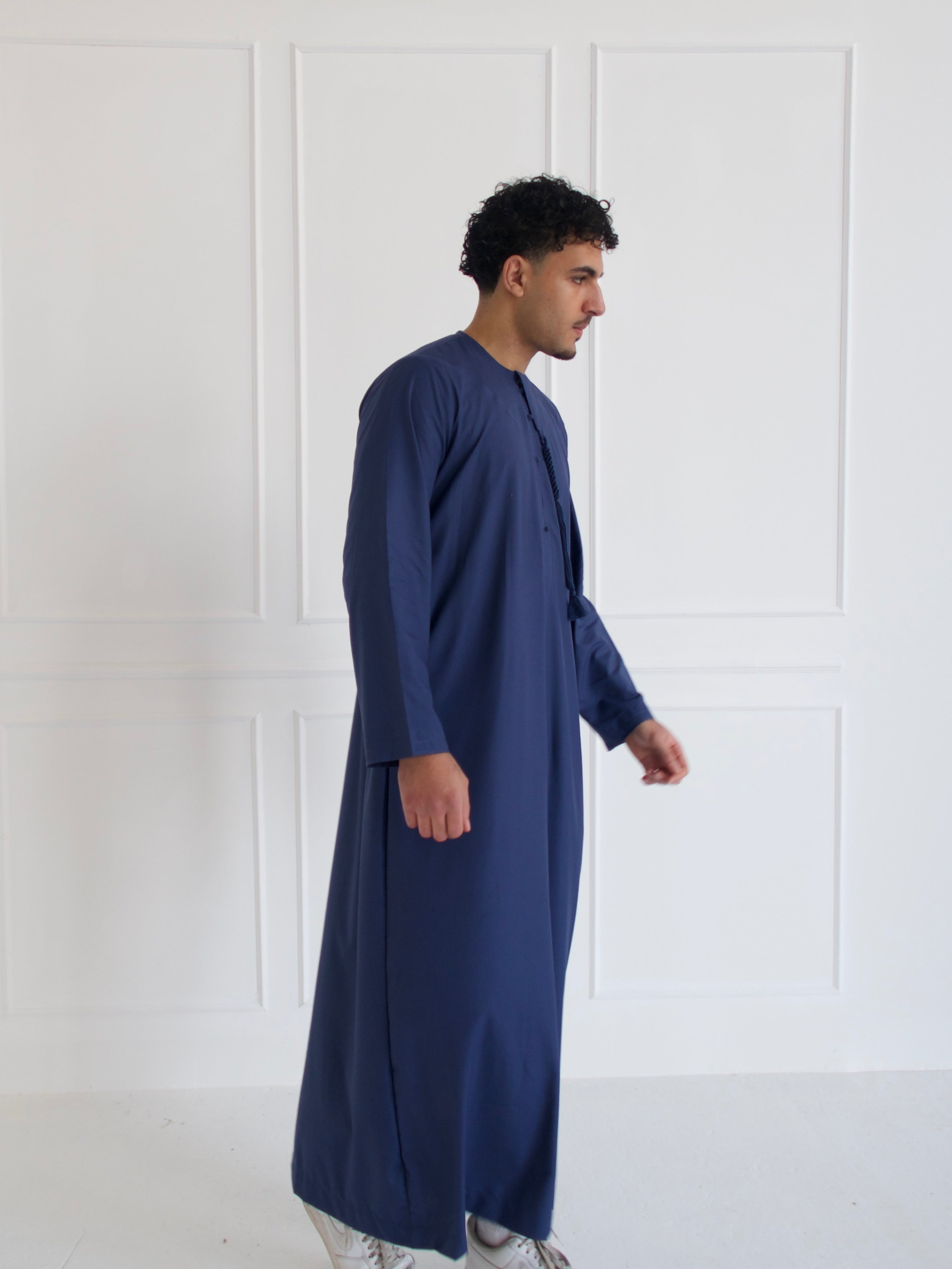 Emirati style Thobe that goes perfectly with our Midnight blue layered abayas or our Navy Reversible organza abaya. Comes with traditional embroidery on the front. Thobe also includes two pockets and buttons to close the front.