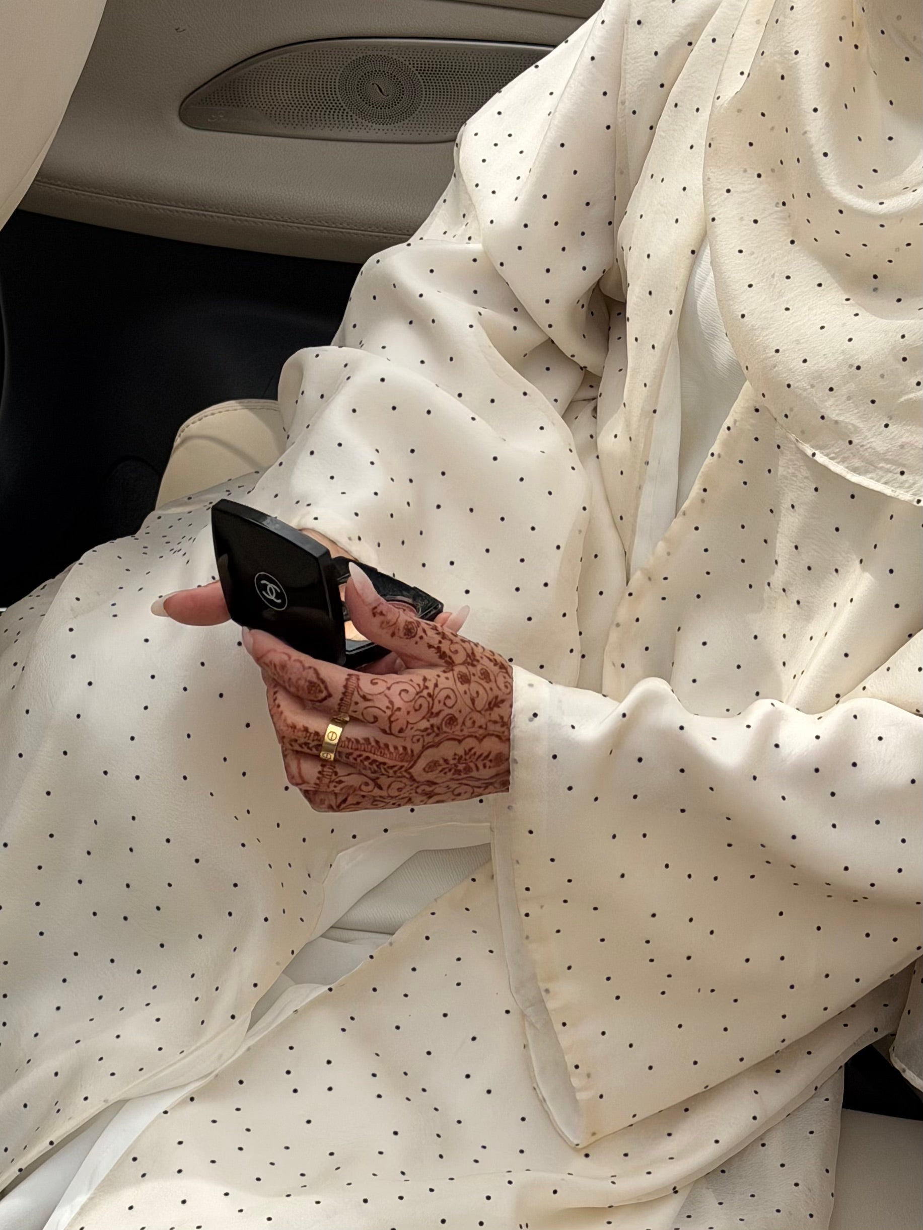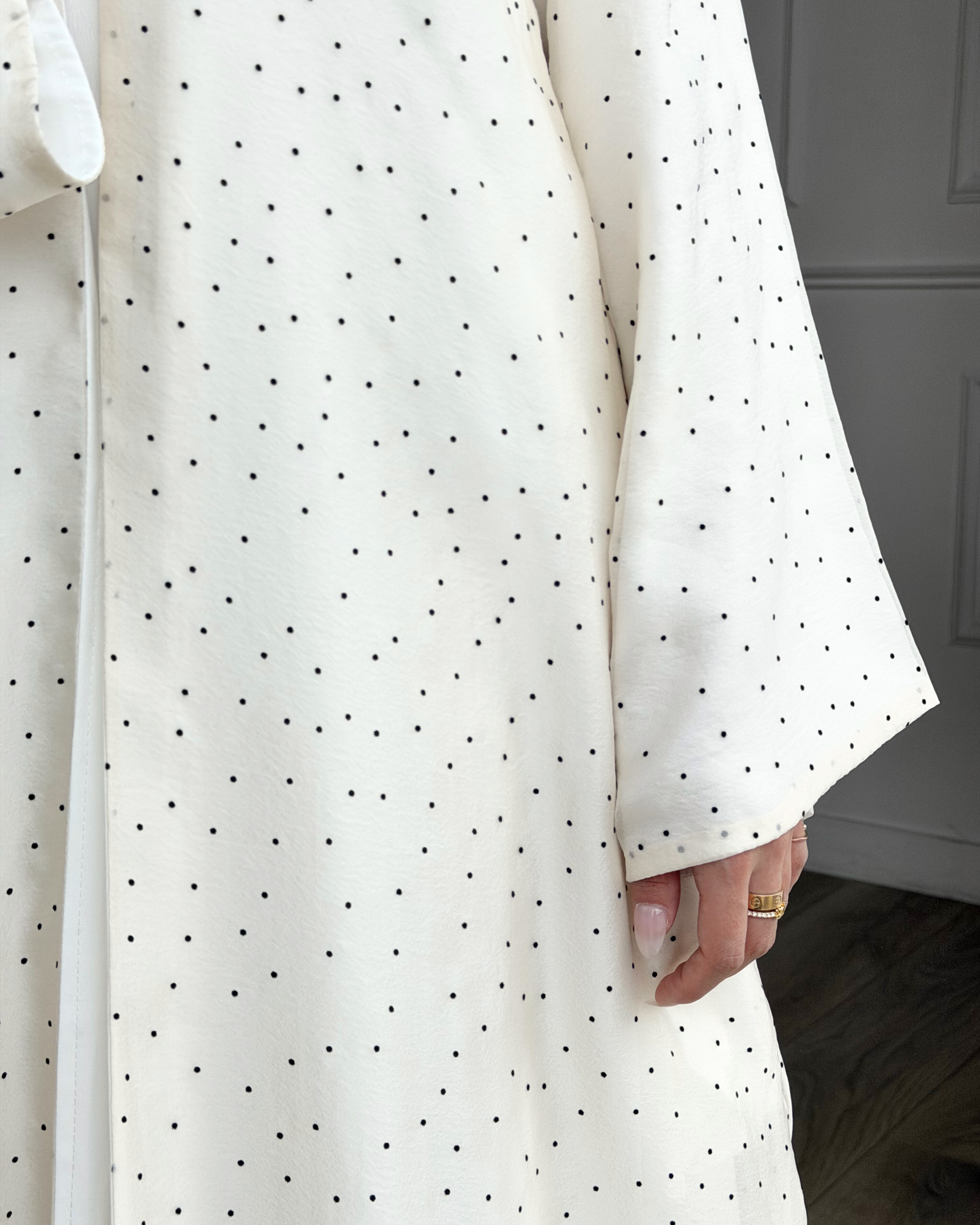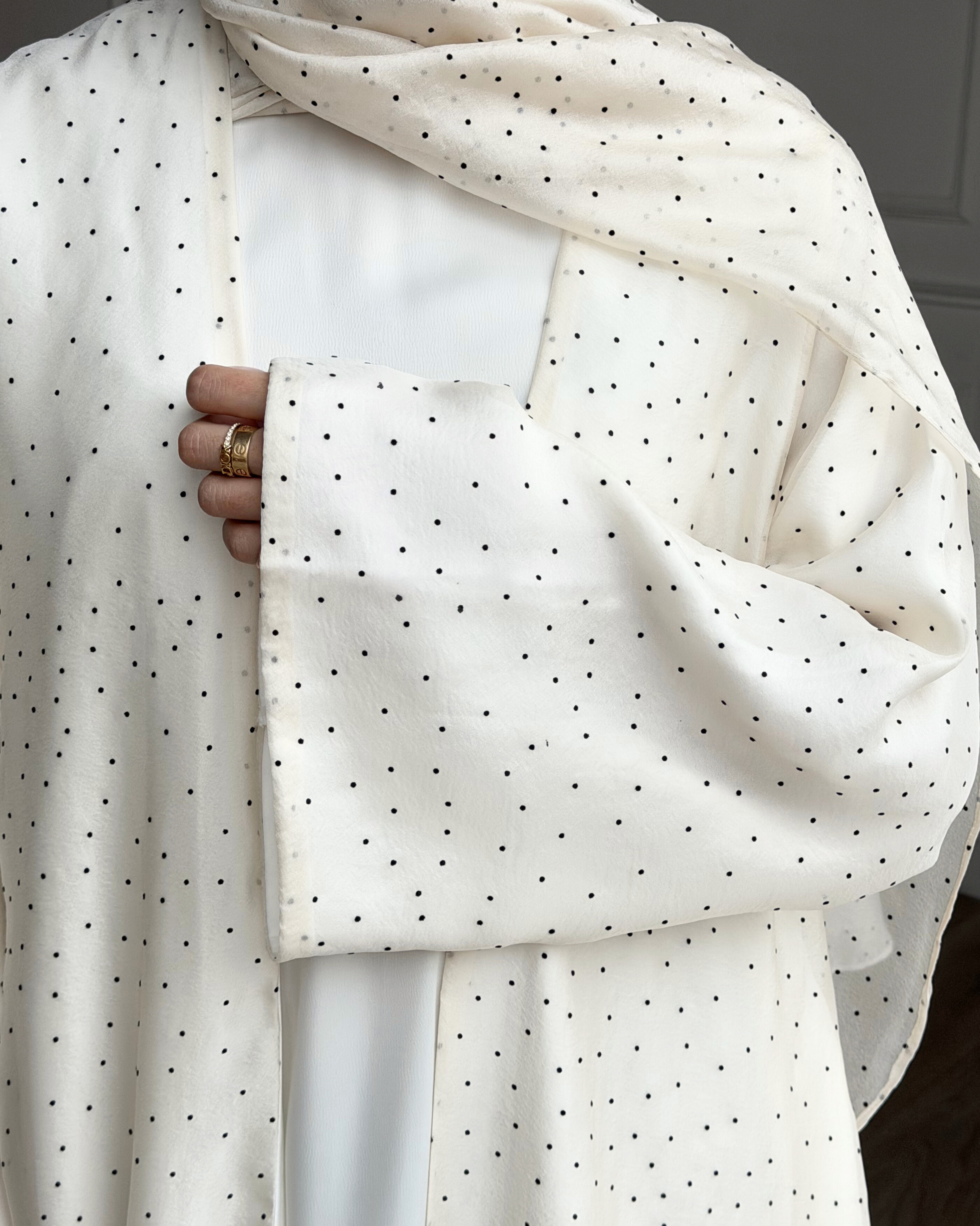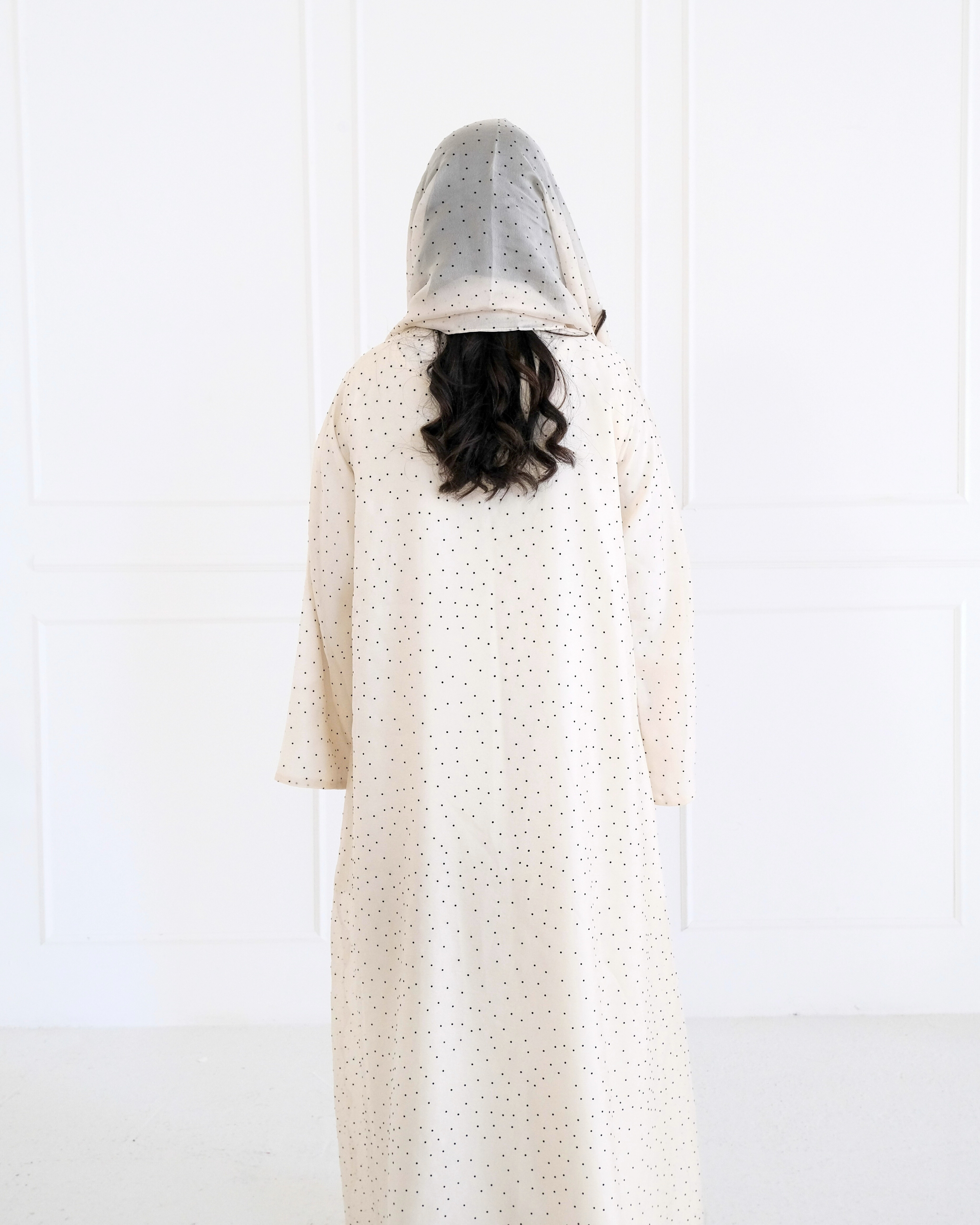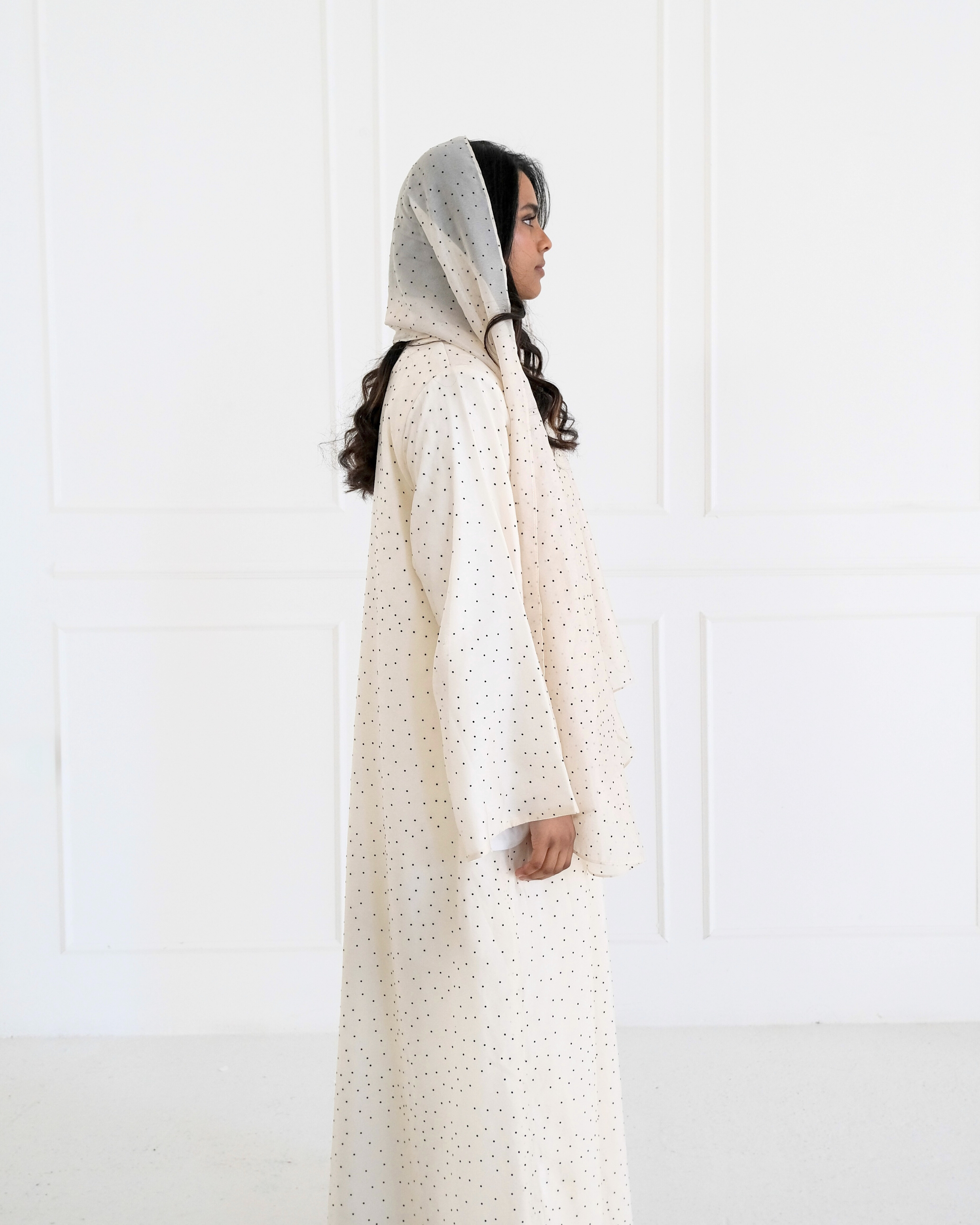 Our Ivory Sprinkle Abaya is crafted from a soft ivory organza base, finished with delicate velvet polka dots scattered throughout. The textured detailing adds depth and a subtle natural sheen, giving the piece an effortlessly refined finish. Designed in our signature soft umbrella cut, it creates an effortlessly flowy, relaxed silhouette with a gentle, natural drape.