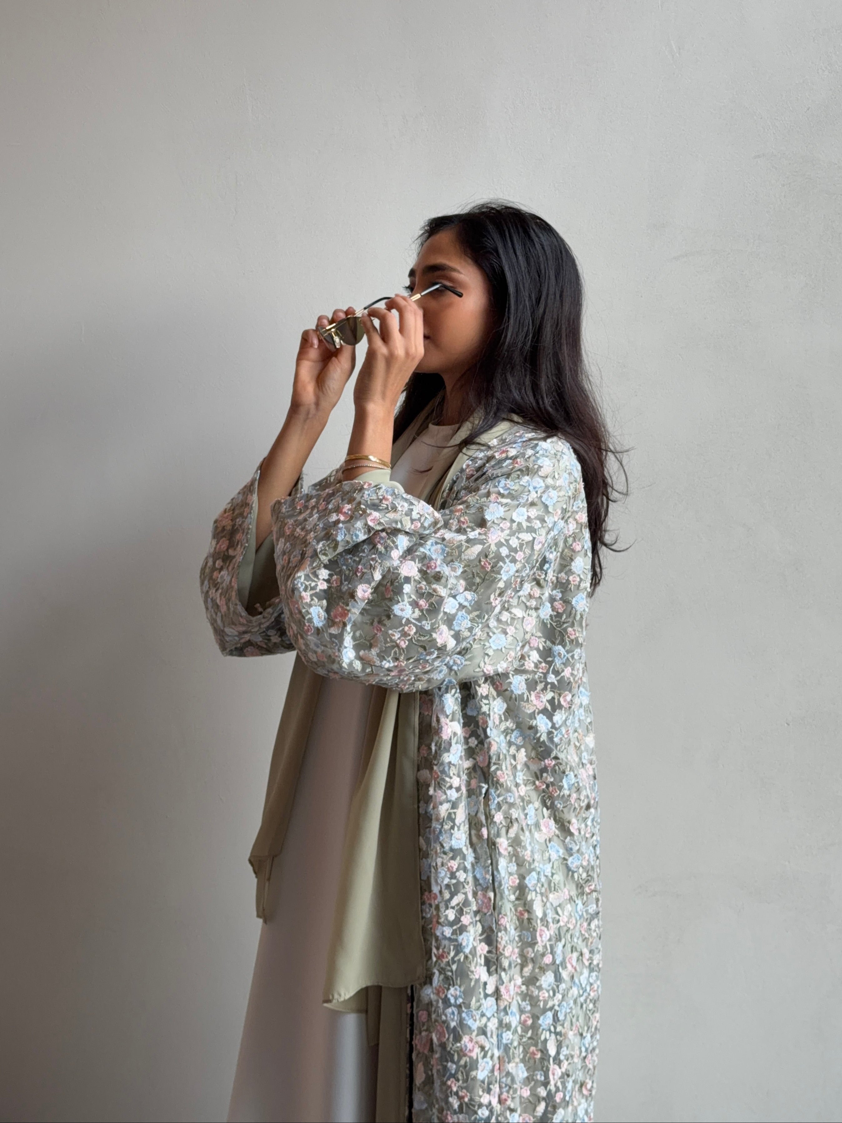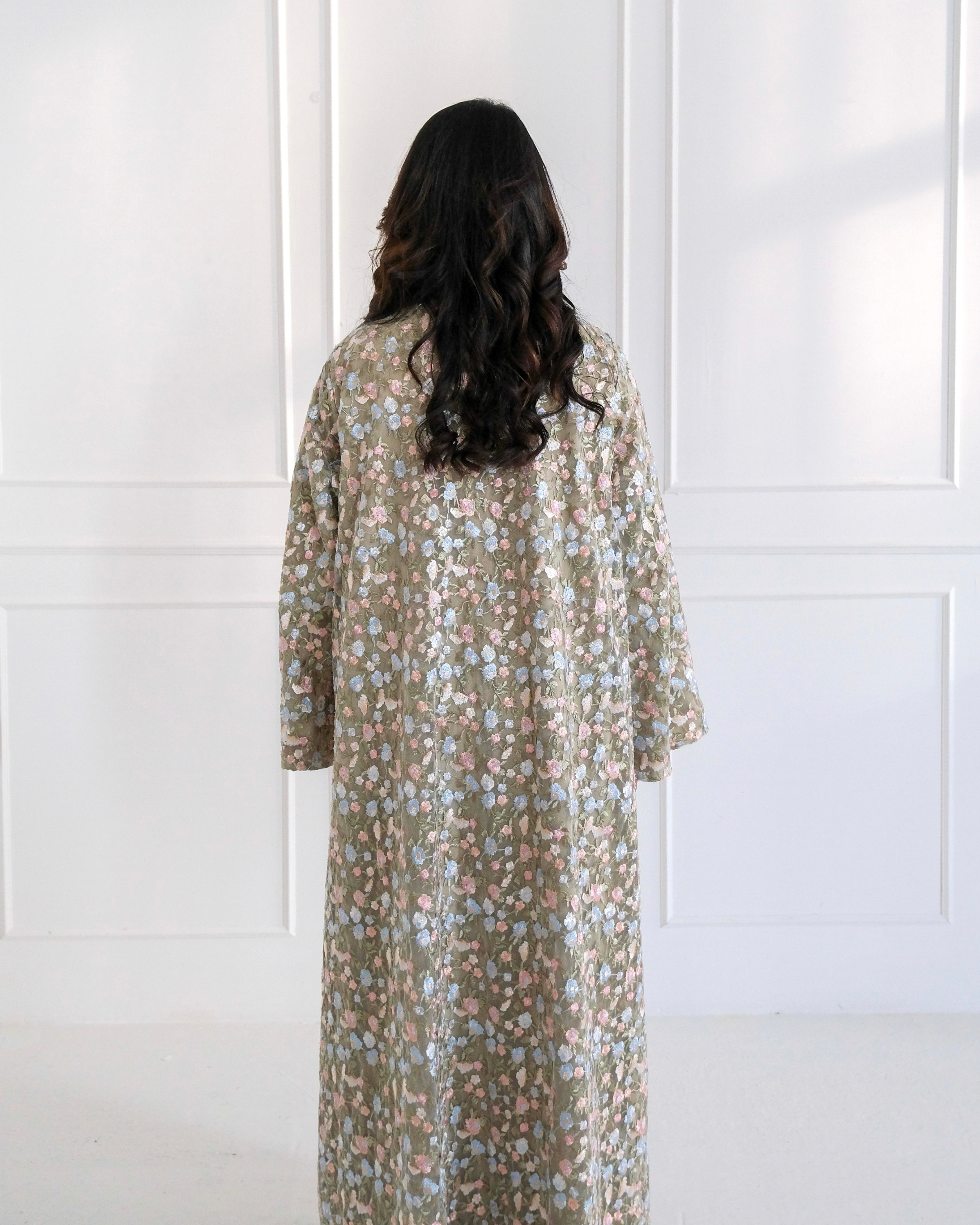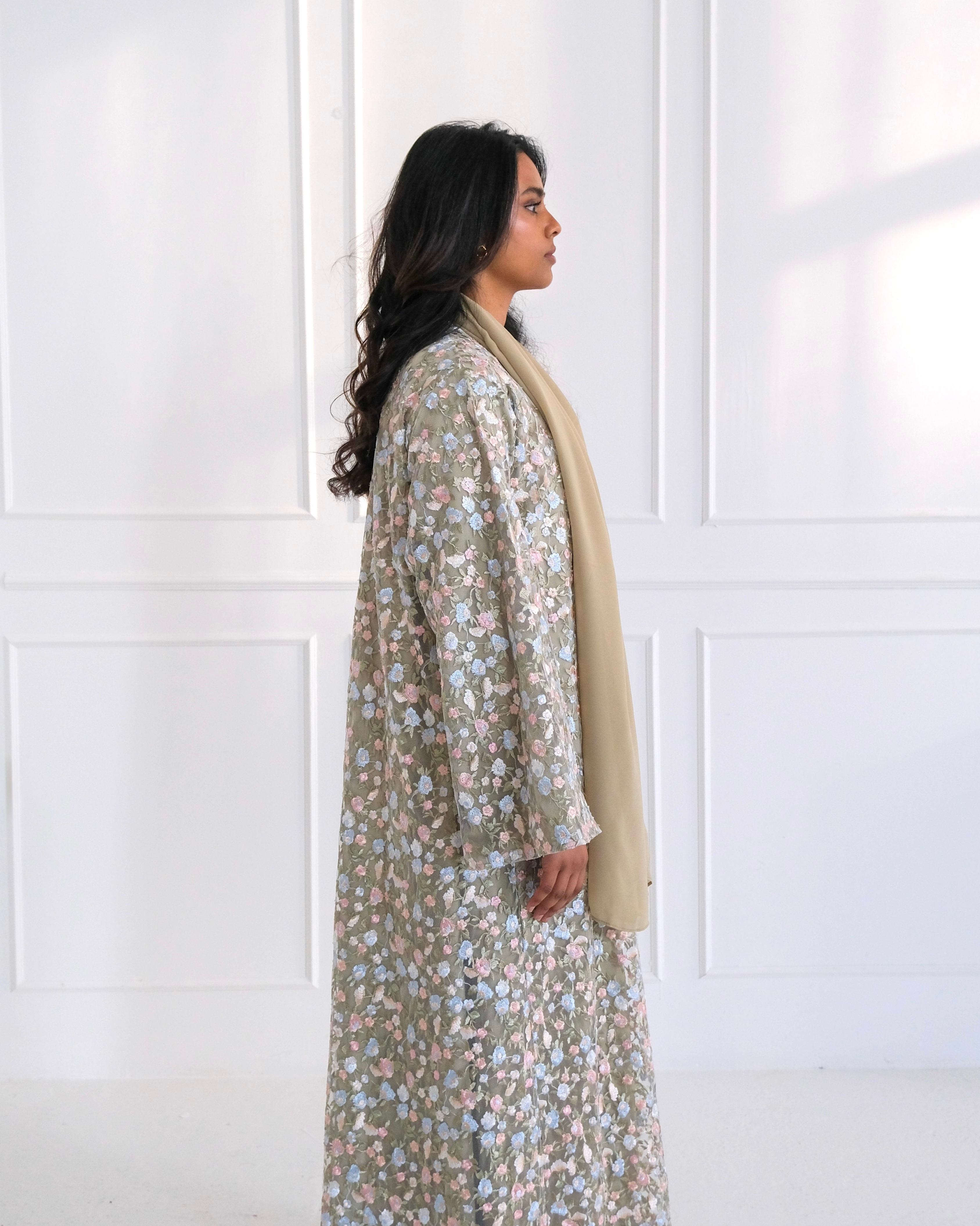 Our Olive Meadow Abaya is crafted from a soft olive lace mesh base, layered with intricate multicoloured floral embroidery throughout for a beautifully detailed and romantic finish. Designed in our signature soft umbrella cut, it drapes effortlessly into a flowy, elegant silhouette with gentle movement.