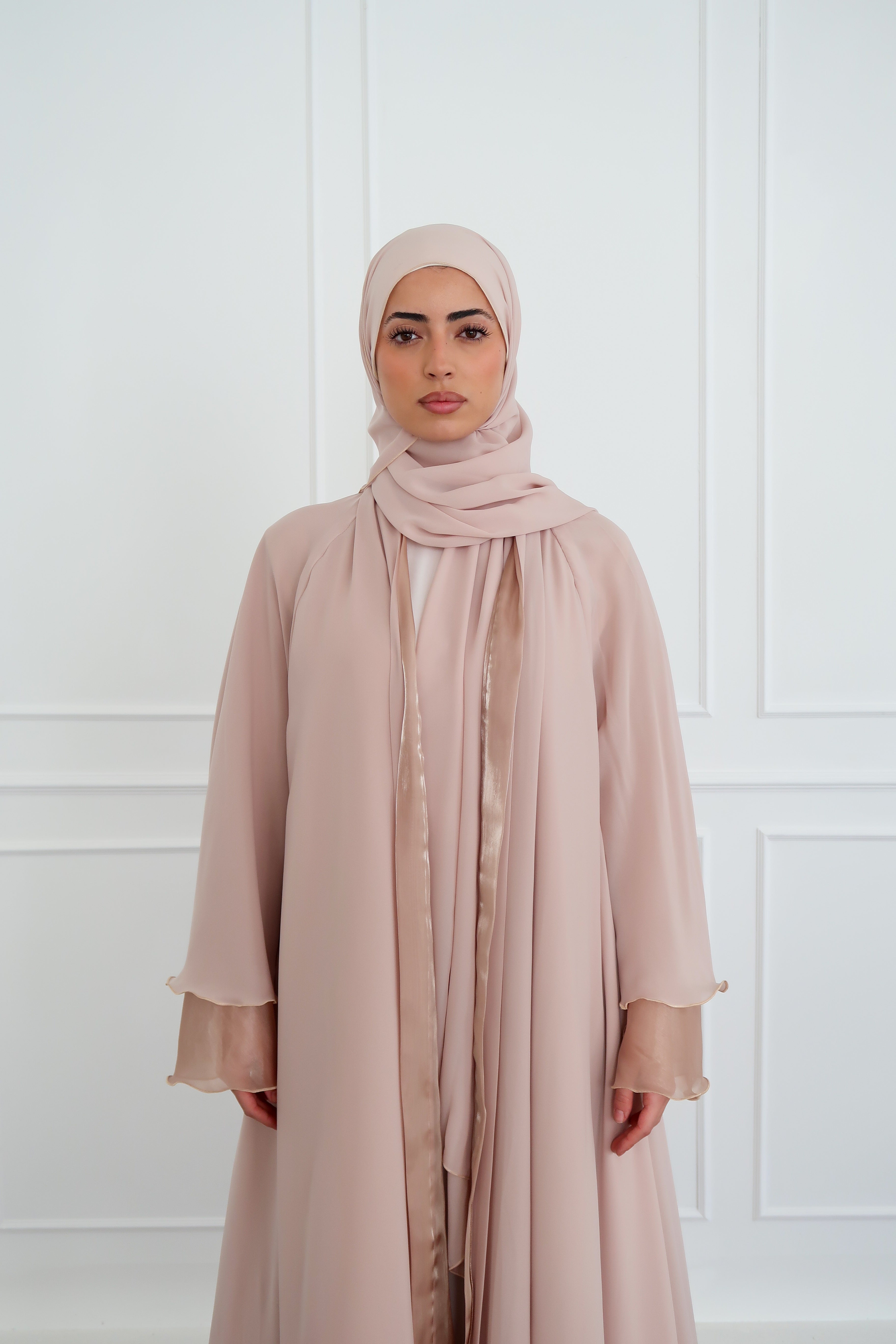Introducing our exquisite Organza Abaya. This unique abaya is thoughtfully crafted to offer two stunning looks in one, featuring a reversible design that allows you to switch between the sheer elegance of organza and the soft, flowing grace of chiffon